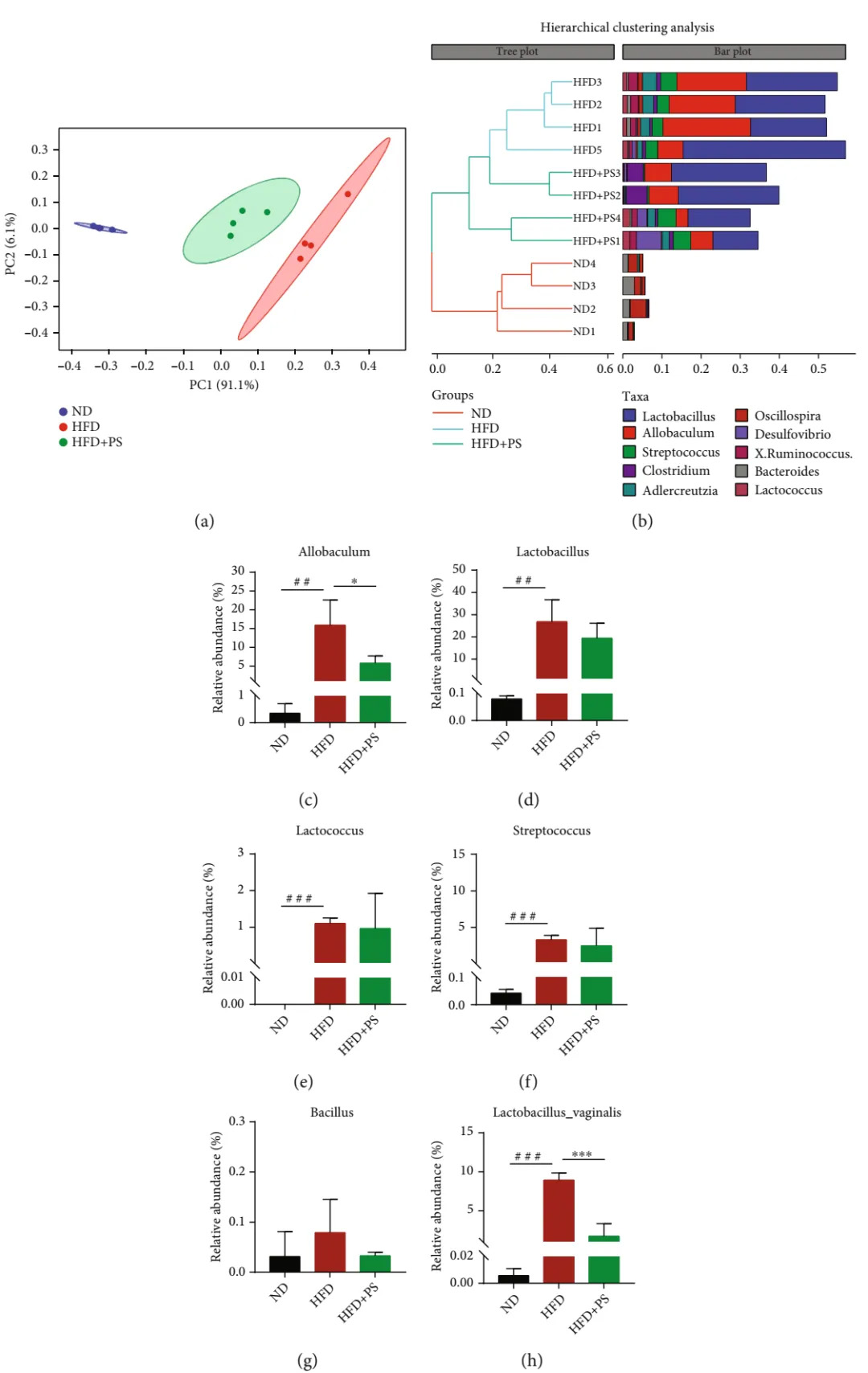 圖5. PS改變了小鼠腸道菌群結構。(a)主成分分析(PCA)圖。(b)層次聚類分析。(c-g)腸道菌群在屬水平上的相對豐度,包括Allobaculum、乳桿菌屬(Lactobacillus)、乳球菌屬(Lactococcus)、鏈球菌屬(Streptococcus)、芽孢桿菌屬(Bacillus) (每組n = 4)。(h)陰道乳桿菌(Lactobacillus vaginalis)的相對豐度。(i)腸道菌群與TC、TG、LDL-C、HDL-C、CYPs之間的Pearson相關系數(shù)。與ND組相比,#P < 0.05,##P < 0.01和###P < 0.001;與HFD組相比,*P < 0.05,**P < 0.01和***P < 0.001。