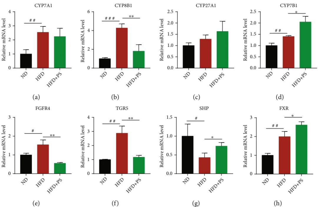 圖3. PS調(diào)節(jié)膽固醇代謝相關酶和受體的mRNA表達。(a~d)肝臟中CYP7A1、CYP8B1、CYP27A1、CYP7B1等CYPs mRNA相對表達量。(e-h)肝臟中FGFR4、TGR5、SHP、FXR mRNA相對表達量。數(shù)據(jù)以均值±SD表示(每組n = 3)。與ND組相比,#P < 0.05,##P < 0.01和###P < 0.001;與HFD組相比,*P < 0.05,**P < 0.01。