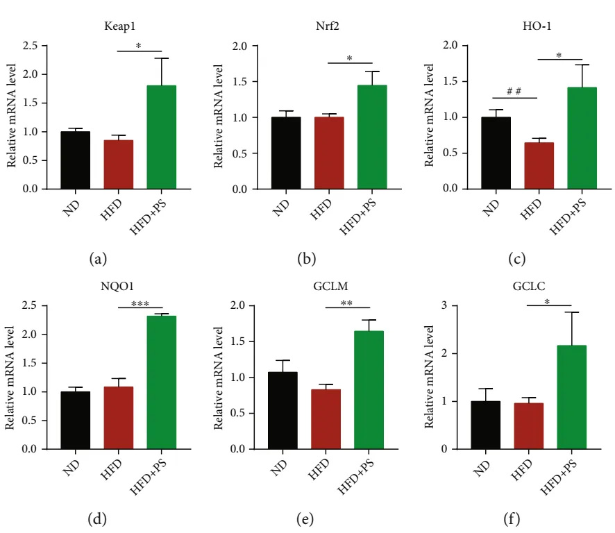 圖2. PS提高了HFD小鼠肝臟抗氧化活性。(a~f)肝臟抗氧化基因Keap1、Nrf2、HO-1、NQO1、GCLM、GCLC的mRNA相對表達量(每組n = 3)。數(shù)據(jù)以均值±SD表示。與ND組相比,#P < 0.05,##P < 0.01和###P < 0.001;與HFD組相比,*P < 0.05,**P < 0.01和***P < 0.001。