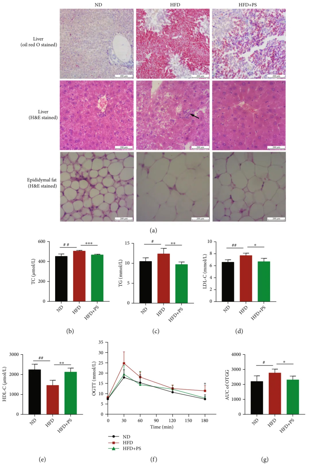 這些結果表明,HFD顯著增加了小鼠血清TG、TC和LDL-C的濃度,降低了HDL-C,導致HLP,并導致糖耐量受損。PS治療逆轉了這些變化,改善了HLP和葡萄糖耐量。