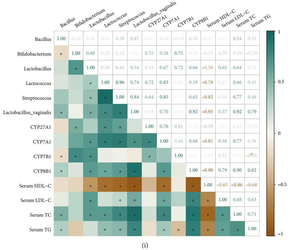 首先,腸道菌群的主成分分析(PCA)結果顯示,ND組、HFD組和HFD+PS組的腸道微生物物種豐度存在不同的聚類(圖6 (a))。此外,層次聚類分析顯示PS處理改變了HFD小鼠的腸道菌群(圖6 (b))。屬水平的微生物群落組成分析顯示,與HFD小鼠相比,HFD+PS小鼠Allobaculum的相對豐度降低(圖6 (c)),乳桿菌屬(Lactobacillus)、乳球菌屬(Lactococcus)、鏈球菌屬(Streptococcus)、芽孢桿菌屬(Bacillus)呈降低趨勢(圖6 (d)-6 (g))。值得注意的是,在種水平上,PS處理導致HFD小鼠陰道乳桿菌(Lactobacillus vaginalis)顯著減少(圖6 (h))。Pearson相關系數(shù)表明,總體而言,這些產(chǎn)生膽鹽水解酶(BSH-)的腸道微生物群的相對豐度與TG、TC、LDL-C和HDL-C的濃度以及細胞色素P450s (CYPs)的表達顯著相關(圖6 (i))。這些結果表明,PS的降血脂作用與改善小鼠腸道菌群結構有關。