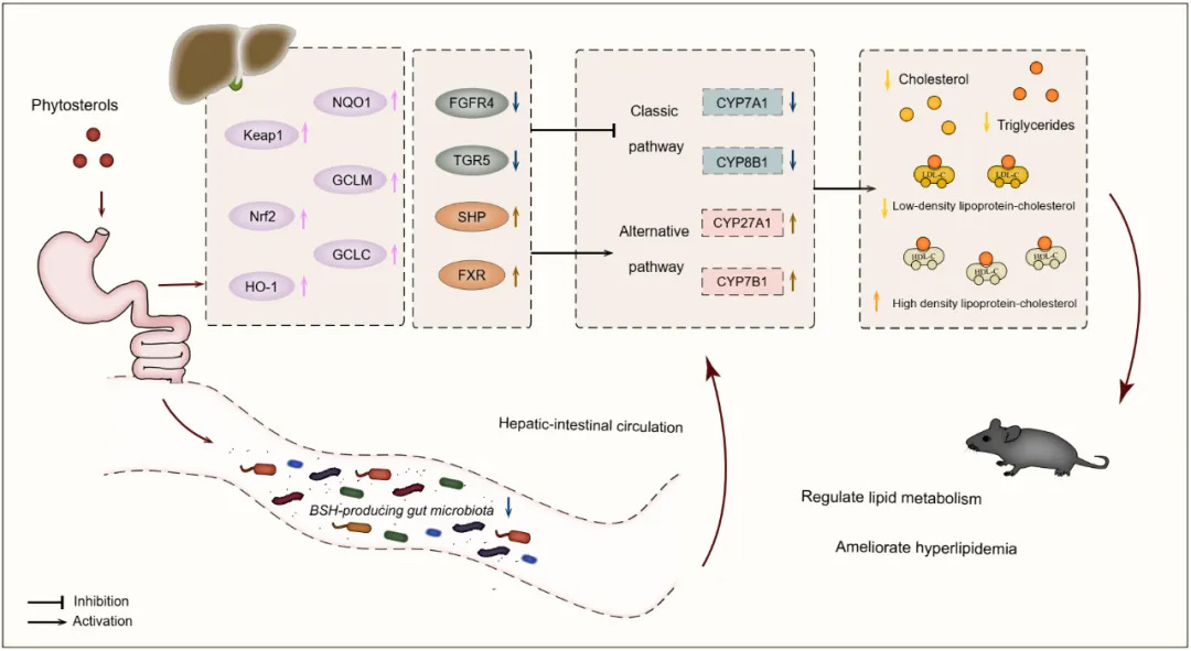 在本研究中,PS治療緩解了HFD小鼠的HLP,血清TG、TC和LDL-C水平顯著降低,HDL-C水平顯著升高。這些變化與已報道的PS降血脂作用一致。此外,我們還檢測了PS對肝臟抗氧化功能的影響。在我們的實驗中,PS提高了HFD小鼠Keap1、Nrf2、HO-1、NQO1、GCLM和GCLC的mRNA相對表達量。本研究表明,PS處理不僅沒有引起HFD小鼠肝臟損傷,而且增強了肝臟的抗氧化作用,緩解了高脂對動物體的傷害。其機制與調(diào)節(jié)膽固醇代謝和腸道菌群結構有關。PS處理可調(diào)節(jié)腸道菌群的相對豐度,激活SHP和FXR,抑制FGFR4和TGR5,抑制BA合成的經(jīng)典途徑(CYP7A1和CYP8B1),激活BA合成的替代途徑(CYP27A1和CYP7B1)。本研究結果部分解釋了PS治療HLP的機制,可能與調(diào)節(jié)膽固醇代謝途徑和腸道菌群結構有關。