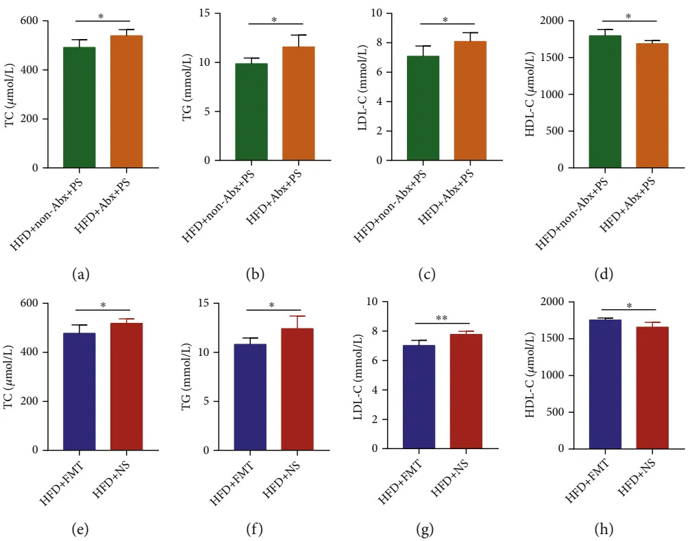相關研究表明,腸道菌群及其代謝產(chǎn)物與膽固醇代謝密切相關。為了驗證PS的降血脂作用是否與腸道菌群有關,我們用Abx和FMT處理小鼠。結果顯示,與HFD+non-Abx+PS小鼠相比,HFD+Abx+PS小鼠的TG、TC、LDL-C顯著升高,HDL-C顯著降低(圖5 (a)-5 (d))。這意味著PS的降血脂作用被消除。此外,我們用PS處理FMT供體小鼠,并對Abx預處理的HFD小鼠給予FMT。與HFD+NS小鼠相比,HFD+FMT小鼠的TG、TC、LDL-C顯著降低,HDL-C顯著升高(圖5 (e)-5 (h)),HLP明顯改善。綜上所述,PS緩解HLP的作用與腸道菌群密切相關。